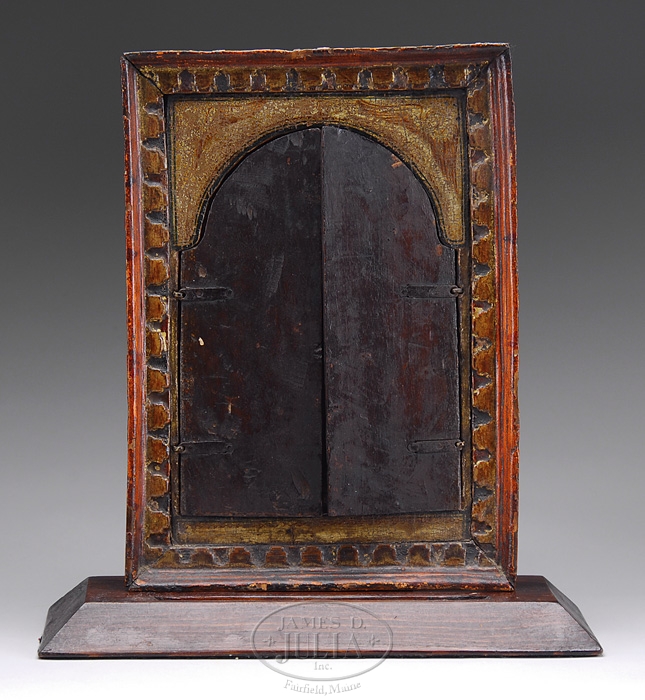 INTERESTING EARLY PAINTED WOOD ICON. Wood icon having two hinged doors which open to reveal a hand painted Madonna and child, below which are three Saints. The inside of the doors having four Saints, one being Saint George slaying the dragon. European, 19th Century or earlier. Some illegible writing to reverse. Comes with a custom wood stand. SIZE: 16-3/4″ x 12″. PROVENANCE: The Estate of Joan B. Hanson, Fair Haven, N.J. CONDITION: Craquelure throughout, some chips with paint loss. 9-95880 (500-1,000)