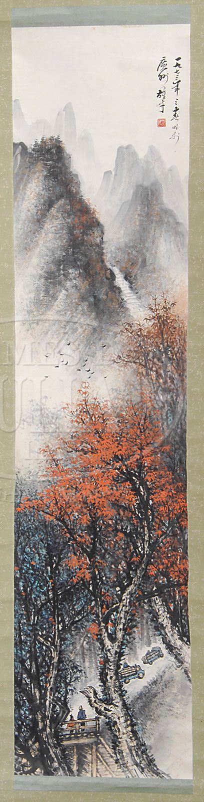 HANGING SCROLL, CHINA, ATTRIBUTED TO LI XIONGCAI (1910-2001). Ink and color on paper, depicting an autumn landscape with maple trees and wild geese. Signed “Xiongcai,” dated year 1973, with one seal, with wood box. SIZE: 52-7/8″ x 12-1/2″. CONDITION: Good with some creases. 9-26351 (800-1,200)