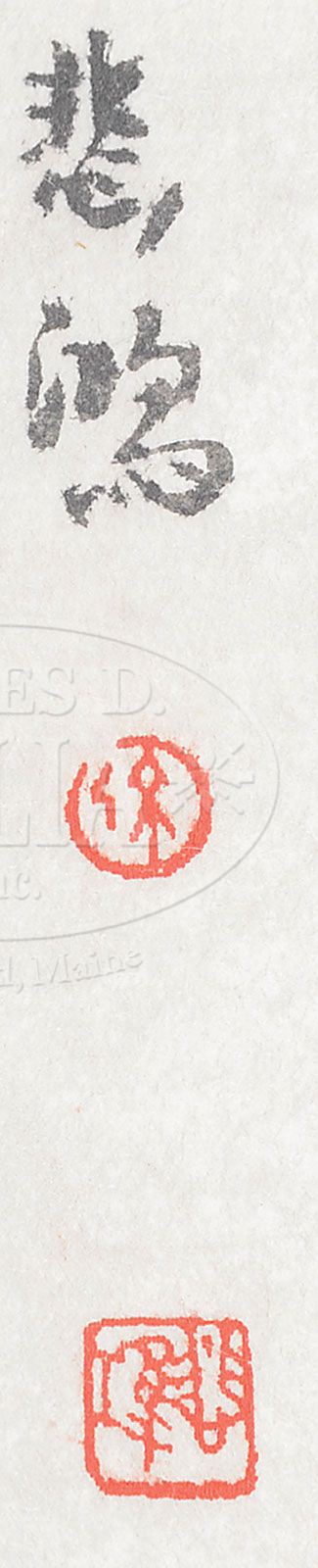 HANGING SCROLL. China, ink and light color on paper, finely depicting a galloping horse, signed “Beihong,” with two seals. SIZE: 26″ x 12-1/2″. CONDITION: Good condition with some creases 9-28386 (400-600)