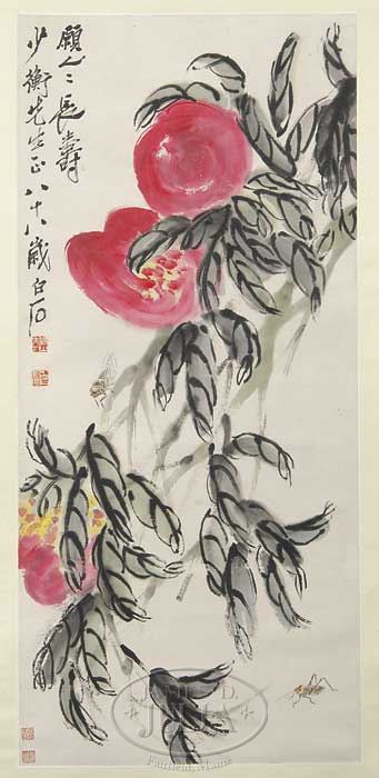 HANGING SCROLL, CHINA, ATTRIBUTED TO QI BAISHI (1864-1957). Ink and color on paper, finely depicting cricket and praying mantis on fruit branches. Inscribed, dedicated to Mr. Shaoheng, signed “Ba shi ba sui Baishi,” with four seals. SIZE: 43″ x 19-3/4″. PROVENANCE: Europe, Private Collection. Formerly in the Macau private collection of Deng Cangwu. CONDITION: Good. 9-26729 (4,000-6,000)
