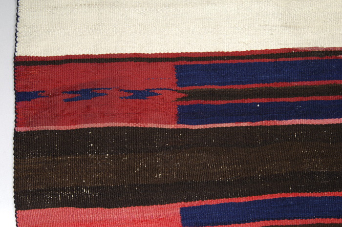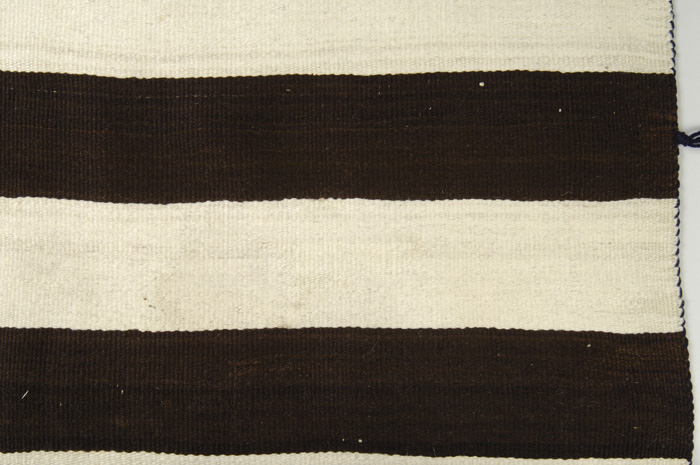 CLASSIC RARE “CHIEF’S SECOND PHASE” NAVAJO MAN’S WEARING BLANKET. Tightly and finely woven, handspun and ravelled wool, in natural ivory, variegated brown, indigo blue, and three shades of lac or cochineal-dyed red, in the “Second Phase” chief’s pattern. Indigo blue chevrons are incorporated into the design of each of 12 rectangles. Circa third quarter of the 19th century. One of the most widely recognized blanket types to emerge during the Classic Period was the so-called chief style, a very specific type of man’s wearing blanket. The word chief is misleading, however, for the Navajos did not have tribal chiefs. Rather, these blankets were rare and valuable trade goods carried to adjacent and distant tribes over lengthy trade routes. Their purchase and use would have been restricted to persons of some wealth and achievement, hence the misnomer. The Navajo chief blanket was woven broader than long with wide horizontal stripe elements dominating the design. Over the course of the nineteenth century the design of this type of blanket evolved in very rigid and easily identifiable patterning phases. Navajo textile scholars have named and numbered these phases sequentially as first, second, third, and (sometimes) fourth. The first phase is categorized by a simple combination of broad white, brown, red, and blue horizontal stripes and was woven during the first half of the nineteenth century. By 1850 innovations in this style were being seen as the weaver interrupted and expanded the center and end stripes by adding elongated rectangles in a twelve-position layout across the blanket. The broad white and brown bands then served as a background for the pattern bands of this second phase. Within a decade the third phase in the development of the chief-style blanket was signaled by a shift from squares and rectangles to a nine-position layout of a central diamond, half diamonds along the four edges, and quarter diamonds in the corners. The same broad white and brown stripes were retained. Information from: Bloomberg, Nancy, Navajo Textiles, University of Arizona Press, 1988. The rare blanket at this auction exhibits the classic twelve-spot rectangular design of the very desirable second phase blankets. SIZE: 54” x 73”. CONDITION: Overall very good. Brown stripes show slight old wear. 4-30245 JJK4 (65,000-85,000)