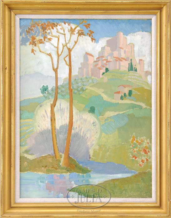 DUNBAR DYSON BECK (American, 1903-1986) “VIEW OF A EUROPEAN VILLAGE”. Oil on canvas laid on board scene shows a terracotta colored large connected European village/castle on top of a hill with terraced fields leading to water. Unsigned. Retaining label on back of backing paper with artist and title. We are told that this is from the dispersal of the Estate in 1986 and that the label on reverse, which has a Cat. # 7-10-86-E-6 is an estate label. Dunbar Beck was a muralist. His murals are in Rockefeller Center and also painted the interior of a piano for President Theodore Roosevelt in the White House. SIZE: 22-1/2″ x 16-1/2″. CONDITION: Very good. 9-94266 (3,000-5,000)