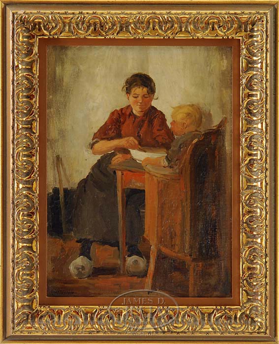 CHARLES PAUL GRUPPE (American, 1860-1940) “BREAD AND MILK”. Oil on board Dutch scene shows a young mother spooning milk to an infant in a high chair. She wears a red shirt with green skirt and wood shoes. Signed lower left “Chas P. Gruppe”. Also titled on reverse and inscribed “My father painted this painting in Holland: His son, Emile A. Gruppe”. Housed in a gesso decorated gilt frame with painted liner. SIZE: 14″ x 10-1/2″. CONDITION: Very good. 9-95726 (1,500-2,500)
