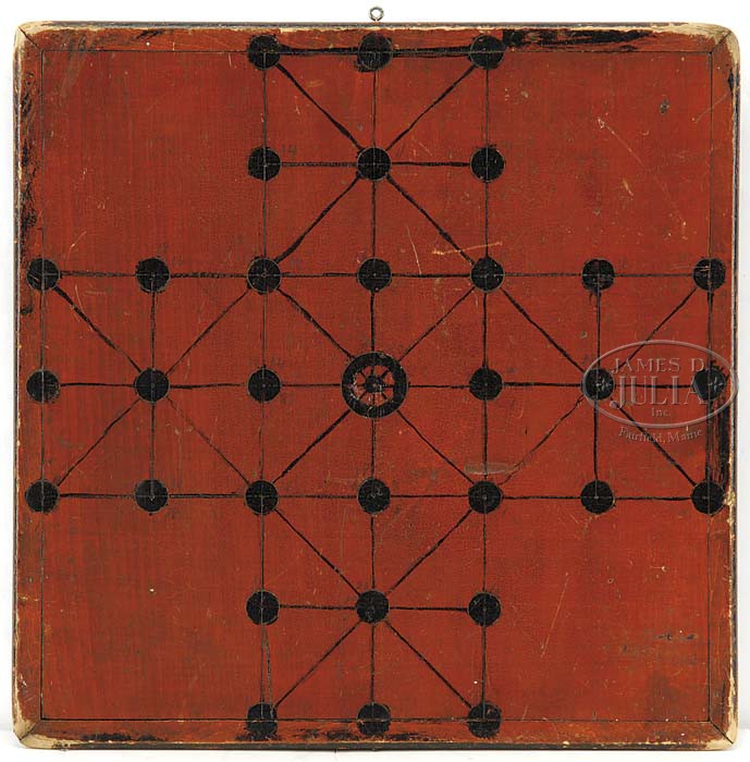 FINE NEW ENGLAND DOUBLE SIDED PINE GAME BOARD. First third 19th century. Square decorated board within a molded surround. Primary checkerboard side in bittersweet and black paint, beneath which is written in script “E. Willis”. The reverse decorated with game board of Fox & Geese in similar paint. SIZE: 14-1/2″ x 14-5/8″. CONDITION: Structurally very good and original and with original painted surfaces showing normal and expected wear. 9-22098 (600-1,000)