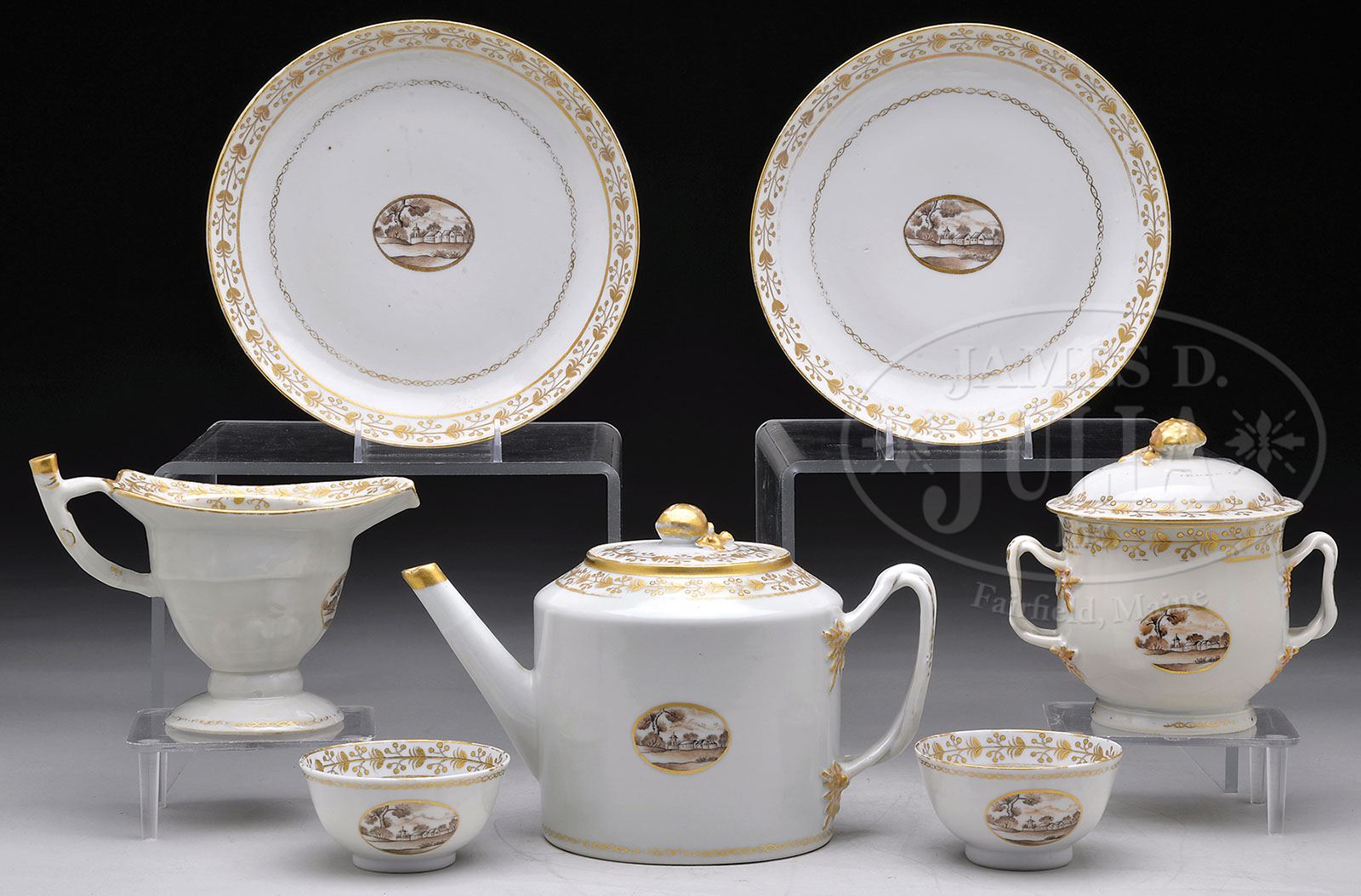 SEVEN PIECE GROUP OF CHINESE EXPORT TEA WARES. 19th century, China. The set includes a teapot with strap handle, covered sugar with strap handle, helmet creamer with cane handle, two teacups, and two shallow bowls. The first two with strawberry knop finials. All gold gilt decorated overall with bands of fruit and floral vinery, each with an oval patera decorated with country landscape. SIZE: Teapot: 5-1/2″ h. Creamer: 4-3/4″ h. Bowl: 7-3/4″ dia. CONDITION: Sugar bowl with large shallow chip at mouth. Minor wear to gilding throughout and with some fleabites. Otherwise very good. 9-90428 (1,500-2,500)