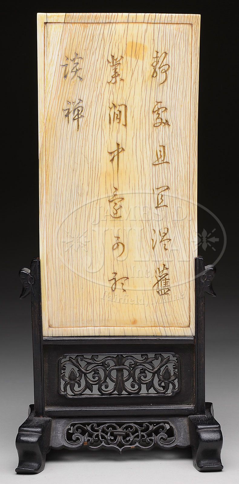 IVORY INK SCREEN. 18th century, China. Scene of a scholar conversing with a monk in a room interior. Reverse decorated with a cursive poem. Traces of polychrome color remaining. Accompanied by fitted rosewood stand. SIZE: 8″ h x 4″ w. CONDITION: Screen very good with appropriate vertical old cracks. Stand with small losses to bottom of frieze, otherwise very good. 7-73442 (300-500)