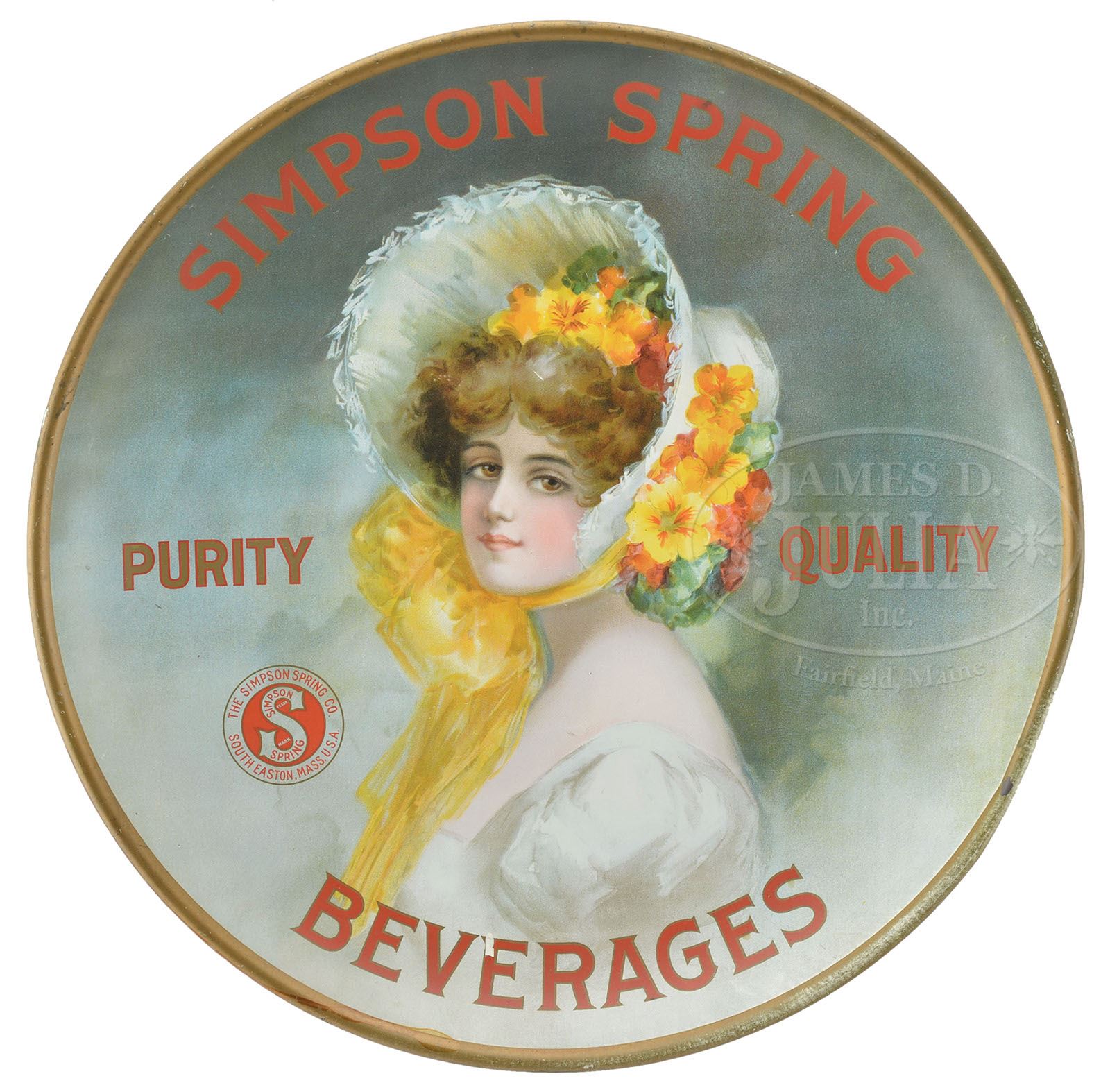 SIMPSON SPRING BEVERAGES TIN CHARGER. An attractive young lady with a bonnet and floral scarf is used as a testimonial to the “Purity” & “Quality” of this South Easton, MA beverage company. SIZE: 17-1/4″ dia. CONDITION: Near excellent; some wear around perimeter rim. 1-13014 (400-800) Auction: Advertising, Toy & Doll - June 2013 Please Note: All prices include the hammer price plus the buyer’s premium, which is paid by the buyer as part of the purchase price. The prices noted here after the auction are considered unofficial and do not become official until after the 46th day. |