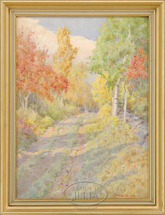 CHARLES GEORGE COPELAND (American, 1858-1945) TWO LANDSCAPES. 1) Watercolor coastal scene with water, rocks and beach signed “Copeland”. Housed in a molded oak frame with matte. 2) Colorful watercolor scene shows a dirt road with rock wall and colorful trees. Signed lower right “Charles Copeland”. Housed in a modern gilt molded wood frame. Charles Copeland was a Thomaston, Maine artist and these probably represent Maine scenes. SIZE: Sight: 1) 9-1/4″ x 12-3/4″. 2) 14-1/2″ x 10-1/2″. PROVENANCE: E. P. George Estate of Boston, MA and Thomaston, ME. CONDITION: Very good. 9-93641 (500-1,000)