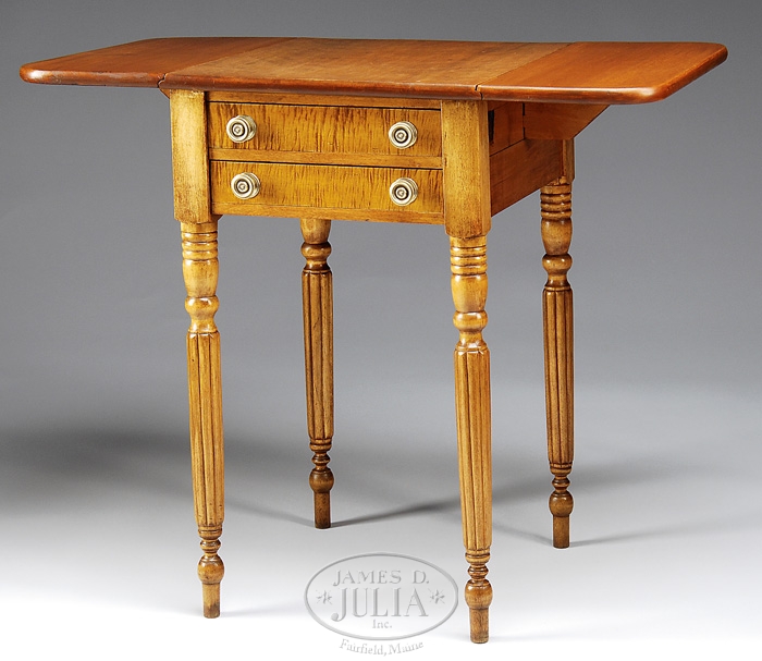 STATE OF MAINE SHERATON MAPLE 2-DRAWER WORKTABLE. Circa 1840. The top with molded edge and hinged de-form leaves. Above the conforming frize fitted with a bank of 2 drawers with tiger maple fronts. Raised on ring turned reeded cylindrical legs, with ringed cuffs on pointed feet. SIZE: 29″ h x 18″ w x 19″ d. CONDITION: With cleaned and repolished surfaces, very good overall. 9-96415 (600-800)