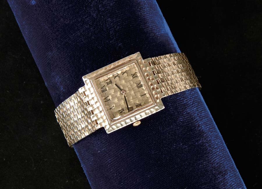 14K LUCIEN PICCARD WRISTWATCH. Unique 14k yellow gold wristwatch has basket weave gold band leading up to square face of the watch. The basket weave design carries on through the face of the watch. Face is marked “Lucien Piccard” and has black Roman numerals. Back of watch case and strap is marked “14k”. SIZE: Overall is 7” l. CONDITION: Minor discoloration to face of watch, otherwise very good. 5-71355 (500-700)