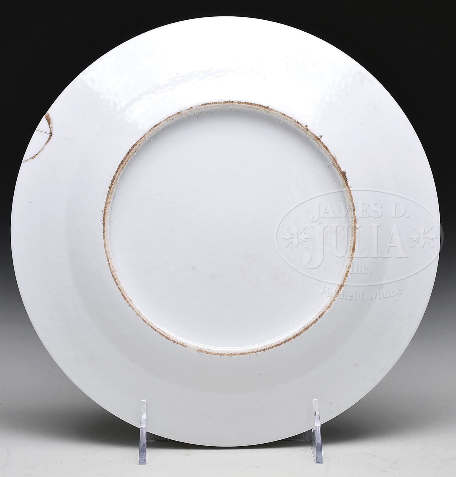 CHINESE EXPORT ARMORIAL PLATE. 18th century. Armorial decoration with crests of a bird and a bearded man. SIZE: 9″ dia. CONDITION: Repaired chip on edge. 7-73523 (200-300)