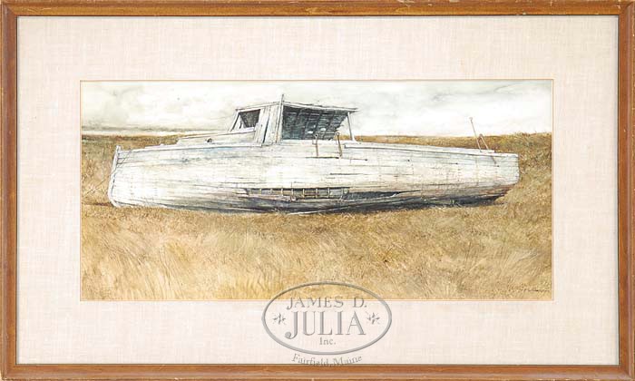 D FALLAM (American, 20th Century) PAST ITS PRIME. Outstanding watercolor in the tradition of Wyeth shows a retired wood lobster boat on its side in the dry grass dunes. Signed lower right what appears to be “D Fallam 1978″. Housed in a wood stained frame with linen matte. SIZE: Sight: 13″ x 28”. CONDITION: Very good. 9-93771 (400-600)