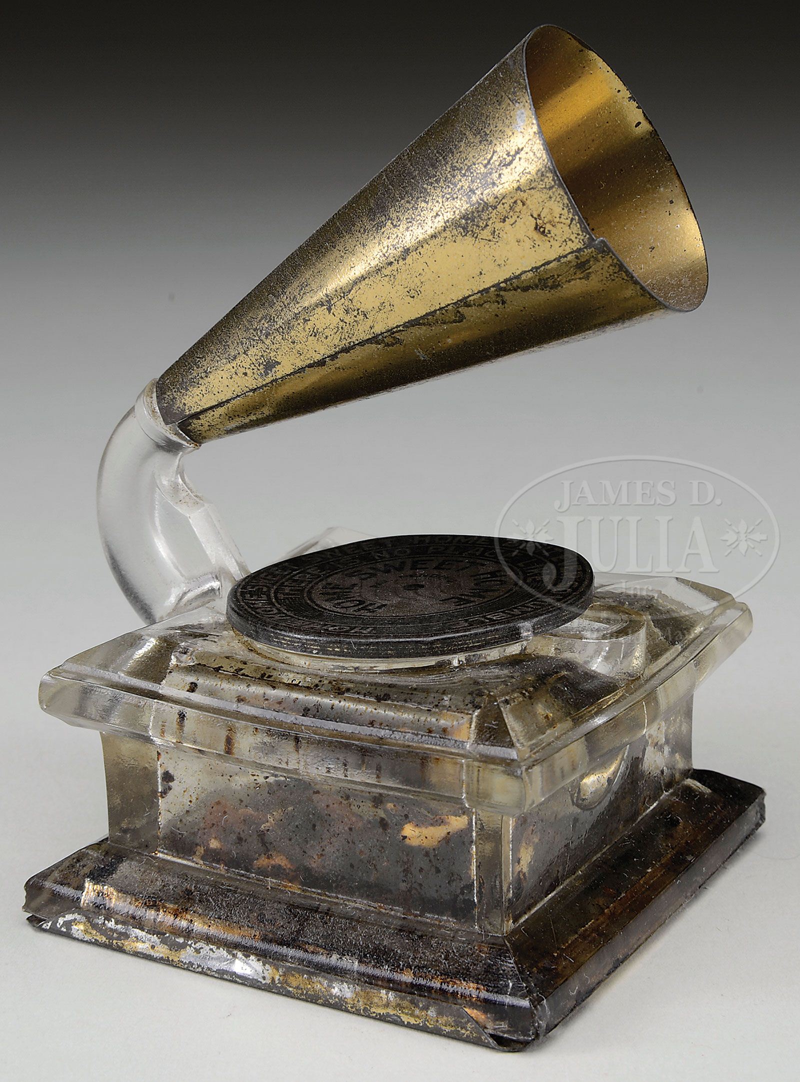 PHONOGRAPH CANDY CONTAINER. E&A 575, DP&P 457. Orig horn, record, candy and closure. Glass near mint. PROVENANCE: From the Betty & “Mack” MacDuff Collection. CONDITION: Condition as noted. 1-12334-92 (450-500) Auction: Advertising, Toy & Doll - Fall 2012 Please Note: All prices include the hammer price plus the buyer’s premium, which is paid by the buyer as part of the purchase price. The prices noted here after the auction are considered unofficial and do not become official until after the 46th day. |