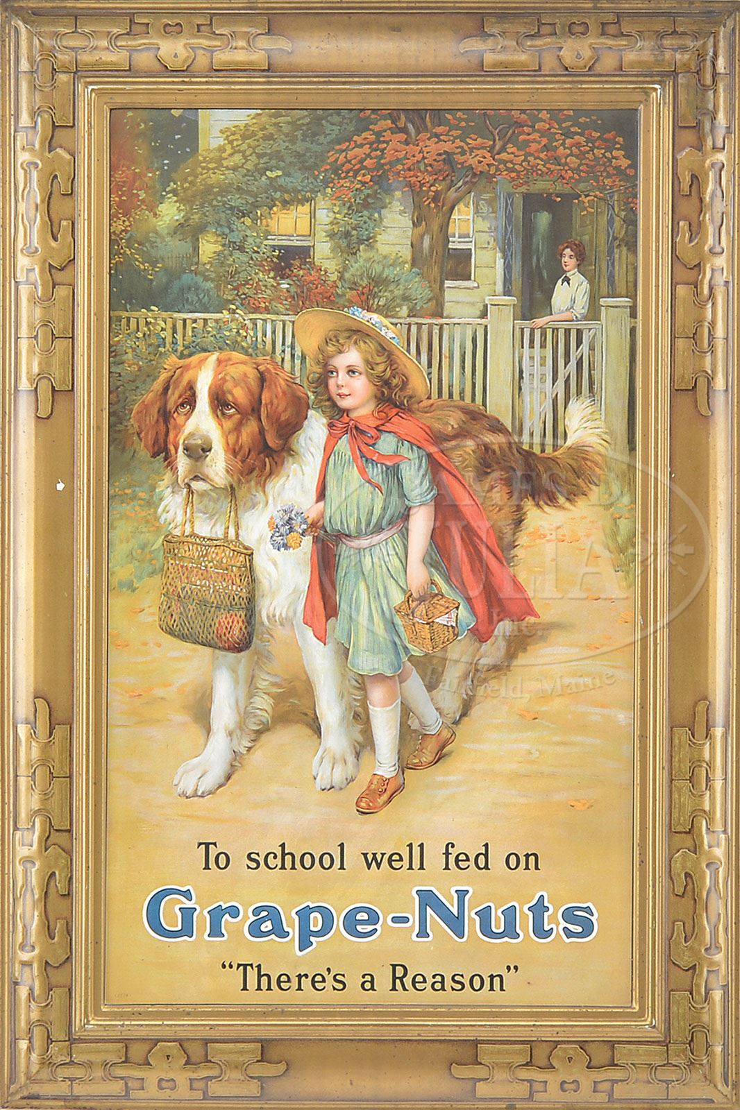 GRAPE-NUTS TIN SIGN. Adorable illustration of young girl on her way to school accompanied by her faithful St. Bernard. Sign features heavily embossed self-framed border. SIZE: 20″ w x 30″ t. CONDITION: Very good to excellent; scattered miniscule chips and nicks predominantly confined to raised border and perimeter edge. 1-13010 (600-1,000) Auction: Advertising, Toy & Doll - June 2013 Please Note: All prices include the hammer price plus the buyer’s premium, which is paid by the buyer as part of the purchase price. The prices noted here after the auction are considered unofficial and do not become official until after the 46th day. |