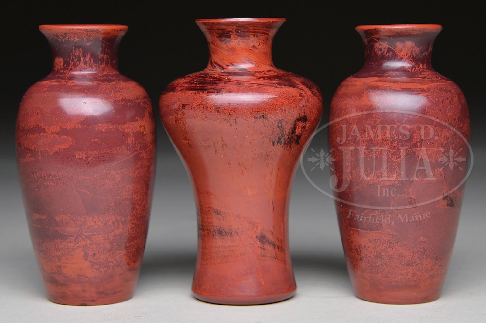 THREE PEKING GLASS VASES. Early 20th century, China. Each realgar style with a raspberry tone. SIZE: 4-1/4″ h. CONDITION: Good overall. 7-73699 (300-500)