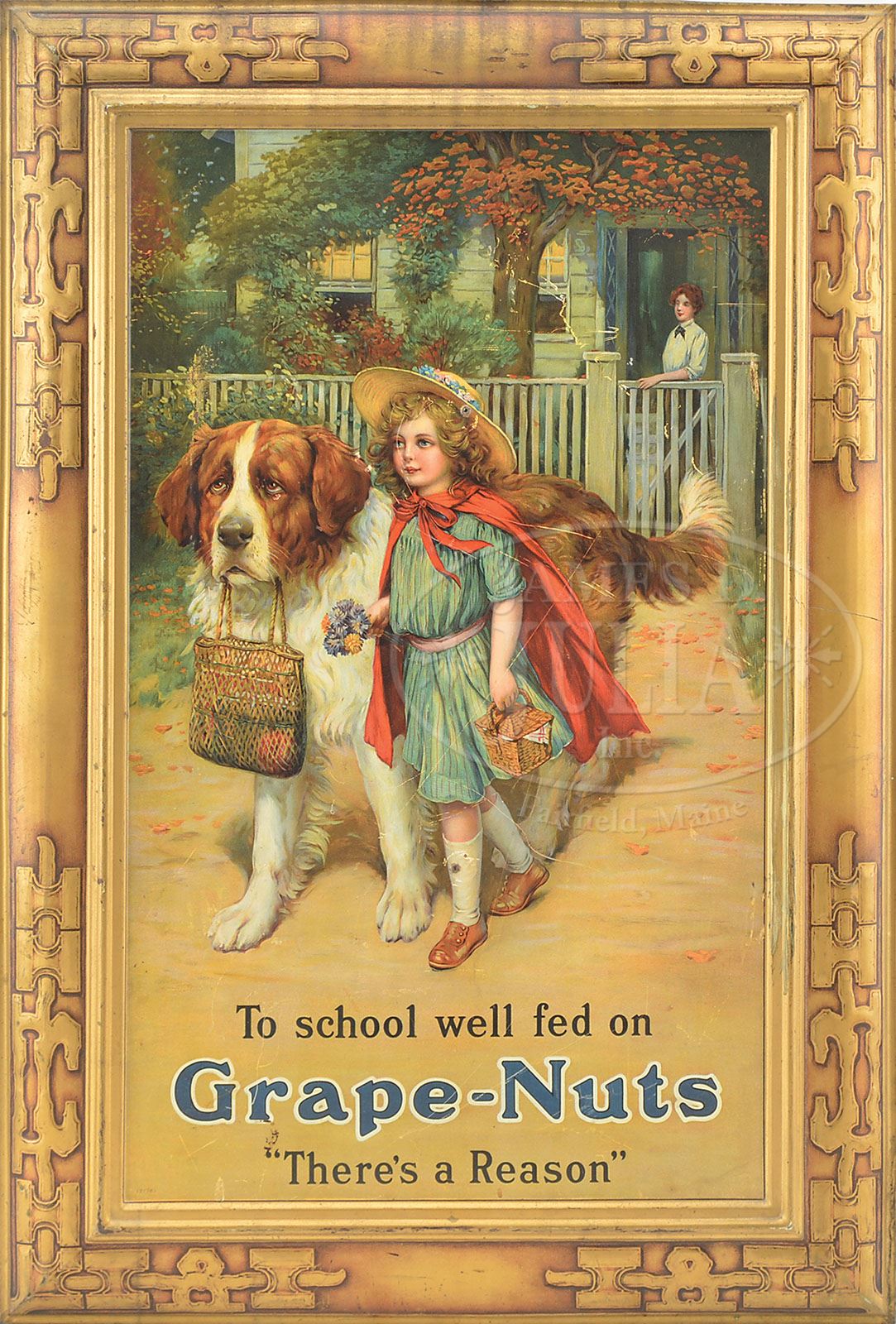 GRAPE-NUTS TIN SIGN. Classic illustration of little girl on her way to school accompanied by her companion St. Bernard. Strongly embossed self-framed perimeter border. SIZE: Overall is 20″ w x 30″ t. CONDITION: Good; 2 nail holes at girls hat and ankle; several field scratches and dent; wear to raised perimeter rim and border. 1-12811 (500-1,000) Auction: Advertising, Toy & Doll - June 2013 Please Note: All prices include the hammer price plus the buyer’s premium, which is paid by the buyer as part of the purchase price. The prices noted here after the auction are considered unofficial and do not become official until after the 46th day. |
