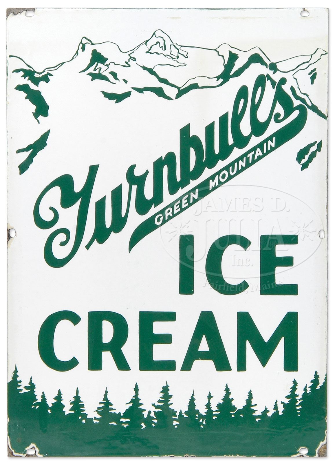 TURNBULL’S ICE CREAM PORCELAIN SIGN. Two-sided sign with graphic renderings of snow covered mountain peaks and evergreen trees for Turnbull’s Green Mountain Ice Cream. Marked at bottom “Mulholland-Philadelphia”, dating it between 1925-1940. SIZE: 20″ w x 27-3/4″ t. CONDITION: Very good with some chips at mounting holes and bottom corners. 1-12635 (200-250) Auction: Advertising, Toy & Doll - June 2013 Please Note: All prices include the hammer price plus the buyer’s premium, which is paid by the buyer as part of the purchase price. The prices noted here after the auction are considered unofficial and do not become official until after the 46th day. |
