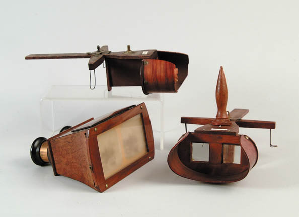 LOT OF THREE STEREOPTIC VIEWERS. Two standard hand held wood viewers and hand held Brewster type with flip up top having a mirror, and binocular type focus and slide in card area. SIZE: Pr are 13” l; other 6-1/2” l x 7”. CONDITION: One has crack in lens housing. 9-94686 (150-250)