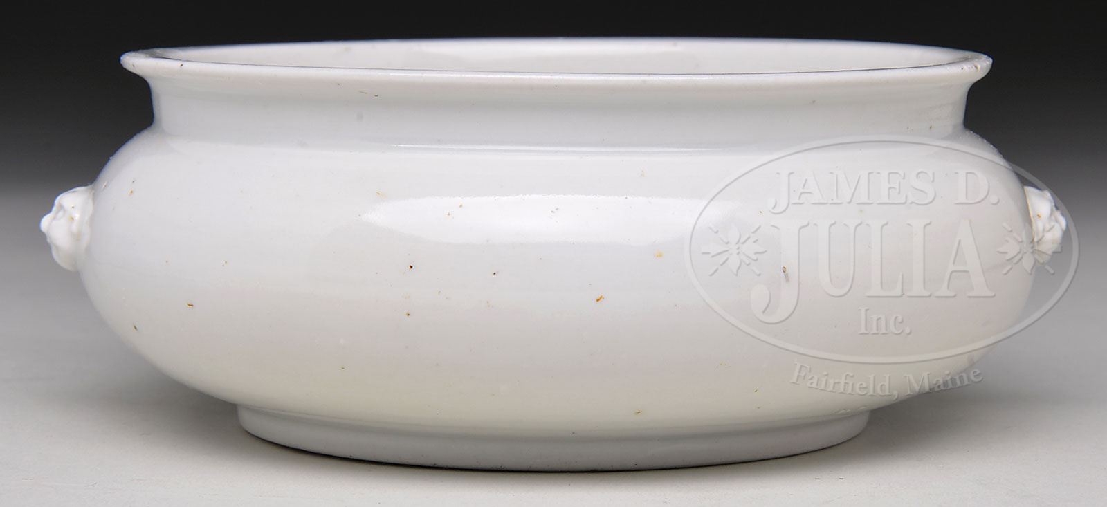 PORCELAIN CENSER. 18th century, China. Blanc de Chine ware with foo dog mask handles. SIZE: 6″ dia. CONDITION: Very good. One handle with slight abrasion on nose. 7-73993 (300-500)