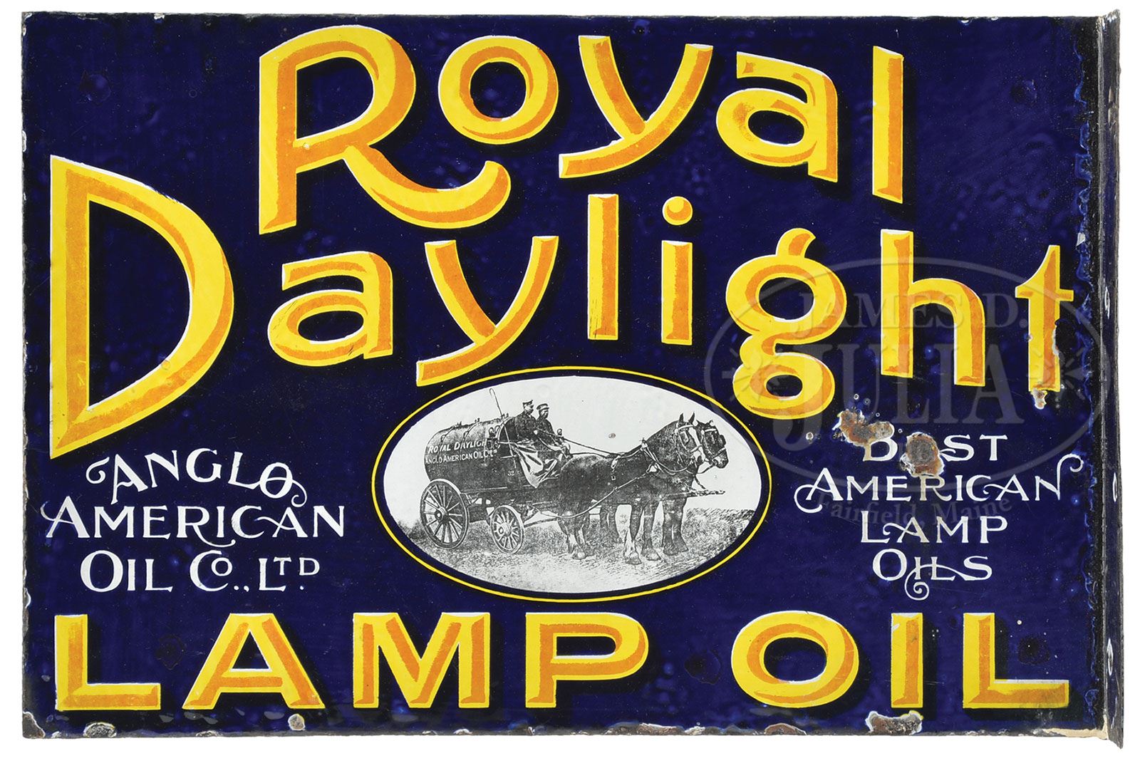 ROYAL DAYLIGHT LAMP OIL PORCELAIN FLANGE SIGN. Very early 2-sided porcelain sign from the Anglo American Oil Co. Ltd. who touted that they made the “Best American Lamp Oils”. This sign also used the lithographic transfer process to create a fabulous image of an early horse drawn oil delivery wagon. SIZE: 21″ w x 14″ t. CONDITION: Very good; has had some repairs to field chips and the area near the mounting flange. Reverse side has a few field chips and some chipping across the bottom. 1-13025 (600-1,200) Auction: Advertising, Toy & Doll - June 2013 Please Note: All prices include the hammer price plus the buyer’s premium, which is paid by the buyer as part of the purchase price. The prices noted here after the auction are considered unofficial and do not become official until after the 46th day. |