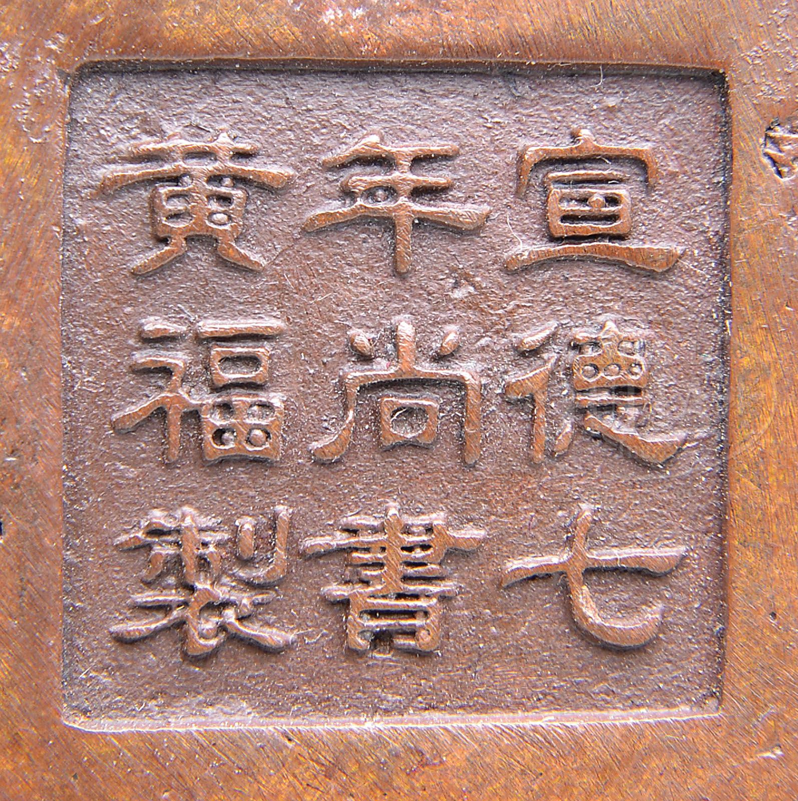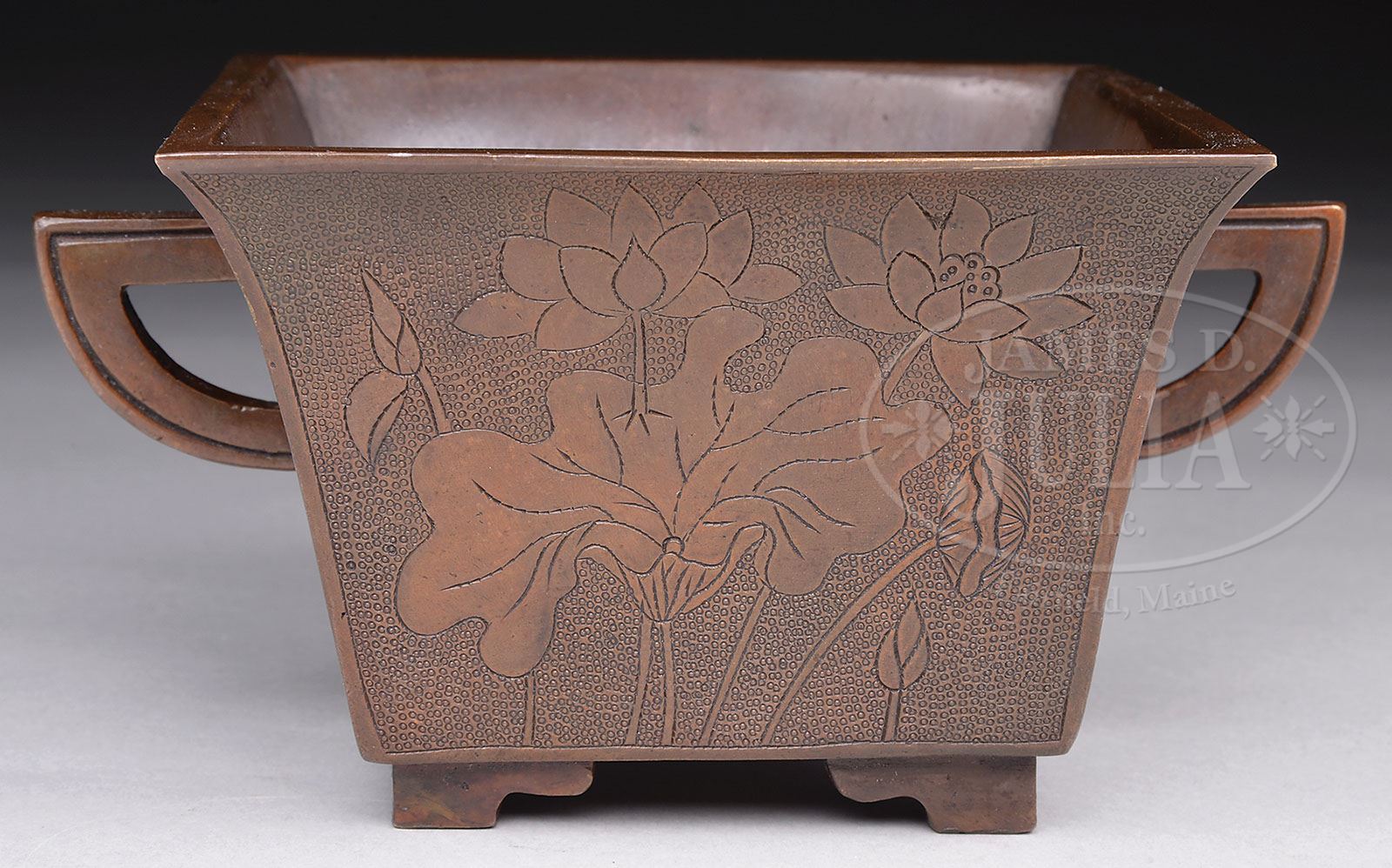 BRONZE CENSER. 19th century, China. Square form with handles. Deep chestnut color. Sides engraved with lotus plants. Hsuan Te mark on the base. SIZE: 5-1/4″ x 5-1/4″ x 3-5/8″. CONDITION: Very good with undisturbed surfaces. 7-74052 (200-300)