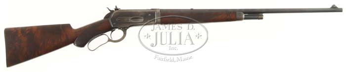 *SCARCE DELUXE WINCHESTER MODEL 1886 TAKEDOWN LEVER ACTION RIFLE. Cal. 33WCF. SN 137789. Lightweight takedown deluxe with 24″ tapered rnd bbl, half mag, pedestal front sight with Lyman ivory bead hunting front sight, a slot blank in the rear seat & a Lyman 21 receiver sight. It is mounted with extremely beautiful, burled American walnut with H-style checkered forearm & semi-pistol grip stock 13-3/8″ over a Winchester embossed hard rubber butt plate. The receiver sight is lightly pitted & probably refinished. Accompanied by a copy of a Cody Firearms Museum letter identifying this rifle with notation “Put in stock as a carbine, 45-70 on March 14, 1907 / May 24, 1907, changed to: rifle”. It goes on to fully identify rifle with checkered pistol grip stock, Lyman 21 receiver sight, Lyman #6 leaf sight & a semi-jack front sight with half magazine, shotgun butt, hard rubber buttplate, takedown & shipped March 24, 1917. It was returned & repaired April 6, 1918 & Jan. 22, 1919, reasons not given. CONDITION: Very fine. Bbl & magazine tube retain 96-97% strong original blue. The receiver retains 60-70-% original blue thin on the right side strong & bright on the left side & in the sheltered areas. Mostly gray metal color on the bottom. The lever retains traces of case colors and the hammer about 90% of its original blue. Wood is sound with light handling use marks & retains most of its beautiful hand rubbed oil finish. Mechanics are fine. Bright shiny bore. 4-56678 JR439 (5,500-7,500)