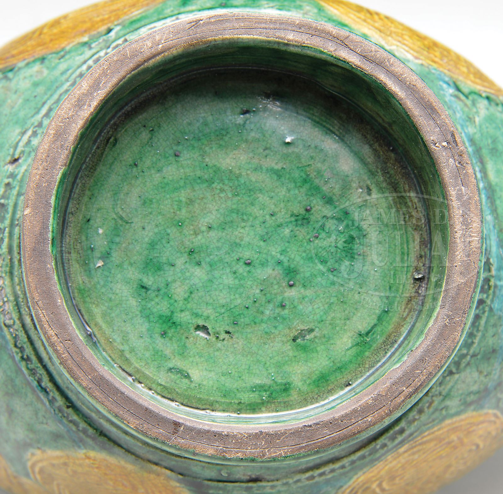 SAN TSAI STONEWARE EWER. 18th century, China. Made in the shape of an archaic ritual bronze Yi. Green and mustard glaze. SIZE: 9″ l x 4-1/2″ h. CONDITION: Very good with two old gold spot repairs to spout and handle. 7-73779 (200-300)