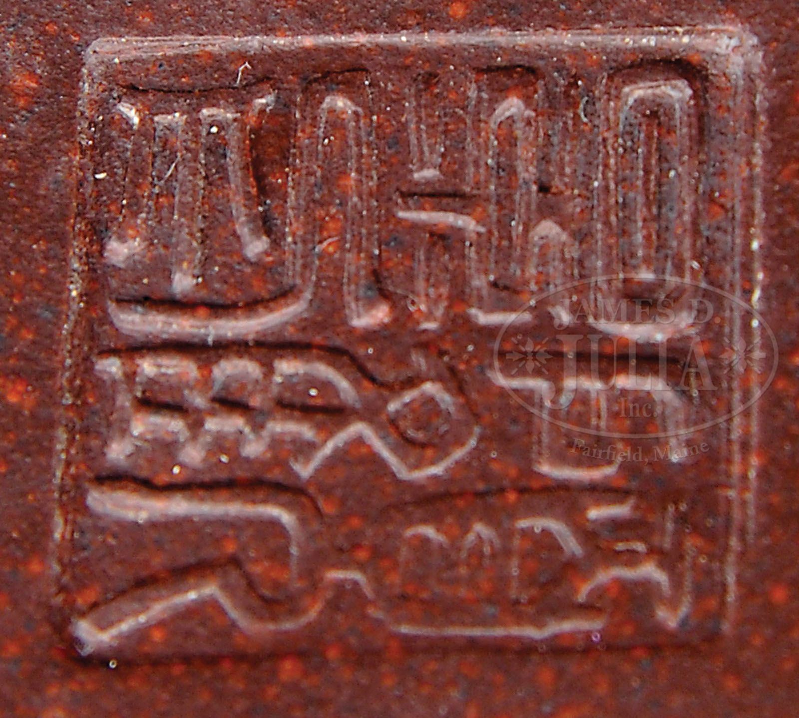 YI HSING TEA POT. 20th century, China. Of circular form, the handle and spout in the form of archaic dragons with an olive green mid band, the lid with conforming finial. Base with seal mark. SIZE: 3-1/2″ h. CONDITION: Very good. 9-28380 (500-700)