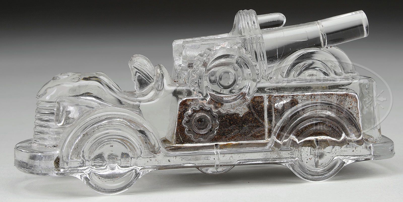 CANNON ON TRUCK CANDY CONTAINER. E&A 126, DP&P 382. Gun barrel repaired. Small chip on top of gear. Stough closure damaged. PROVENANCE: From the Betty & “Mack” MacDuff Collection. CONDITION: Condition as noted. 1-12334-21 (600-800) Auction: Advertising, Toy & Doll - Fall 2012 Please Note: All prices include the hammer price plus the buyer’s premium, which is paid by the buyer as part of the purchase price. The prices noted here after the auction are considered unofficial and do not become official until after the 46th day. |