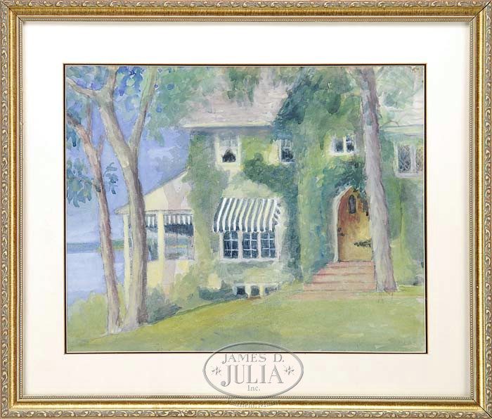 HENRIETTA DUNN MEARS (American, 1877-1970) THE COASTAL HOME. Watercolor scene shows a large house overlooking the water with a cathedral shaped front door and attached veranda. Signed lightly lower right. Housed in a modern gilt frame with double matte. SIZE: Sight: 15″ x 18-1/2″. CONDITION: Very good. 9-93593 (1,000-1,500)