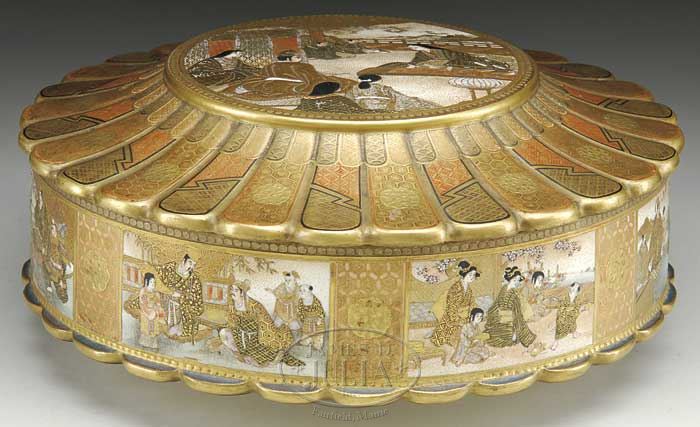 SIGNED SATSUMA BOX WITH COVER. 19th century, Japan. The chrysanthemum shaped lid decorated with court scenes in brocade patterns. Base similarly decorated. Signed Kainkozan. SIZE: 10″ dia. CONDITION: One small chip to one petal on base. Slight craquelure throughout. Generally good. 7-72849 (500-700)