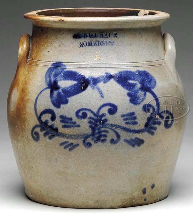 L. & B.G. CHACE SALT GLAZE FLORAL DECORATED CROCK. Second half 19th century, Massachusetts. Bulbous example decorated in underglaze blue with stylized tulips over scrolling stems with incised mark “L. & B.G. CHACE/SOMERSET”. SIZE: 10-1/2″ h x 10-1/2″ dia. CONDITION: With discoloration to proper right side and with multiple chips on top rim, otherwise good. 9-22895 (300-400)