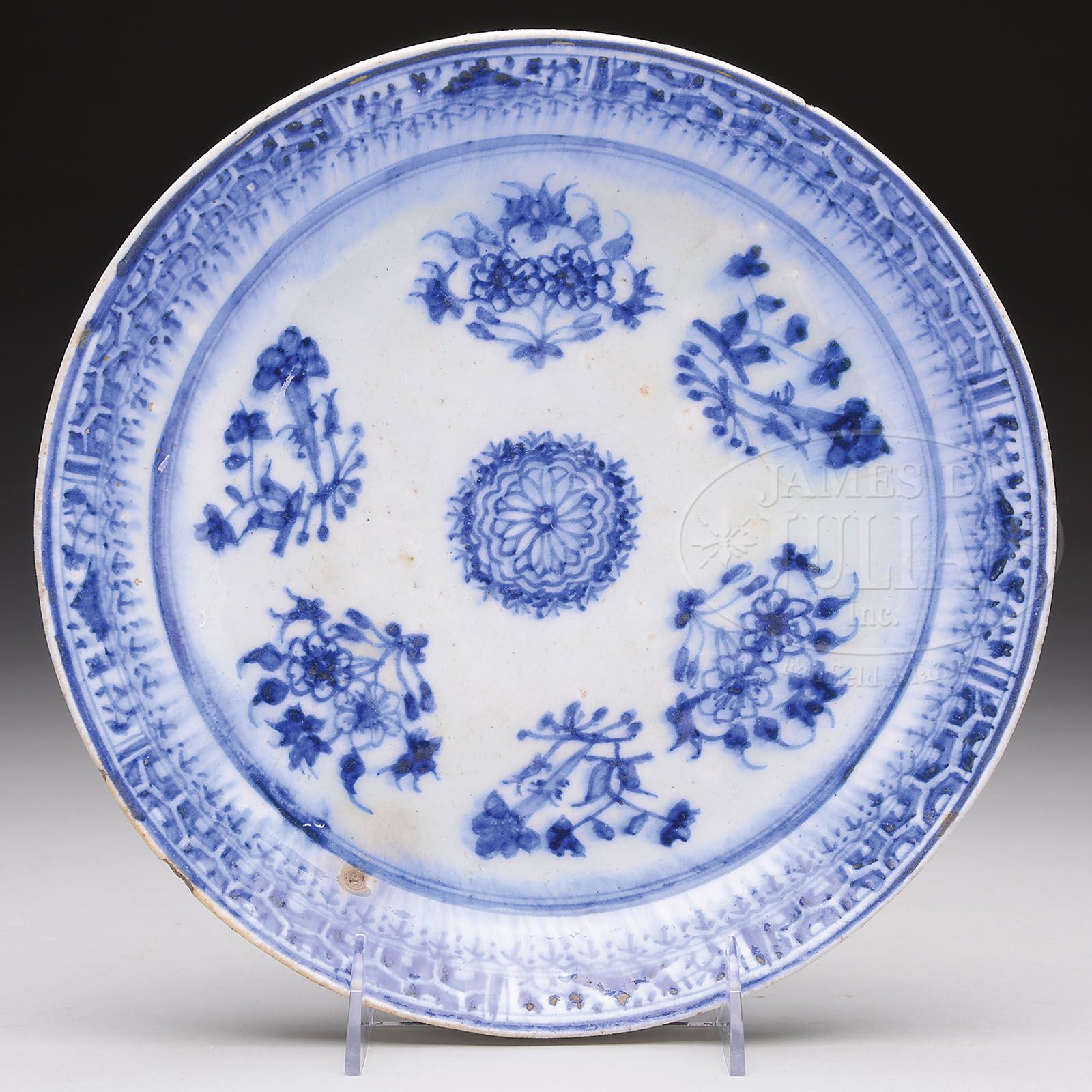 STONEWARE BOWL. 19th century, Persia. Underglaze blue decoration of floral sprigs and brocade pattern borders. SIZE: 2″ h x 9-3/4″ dia. CONDITION: Areas of discoloration in glaze. Various shallow old chips on plate rim and base rim and with craquelure. 7-73404 (200-300)