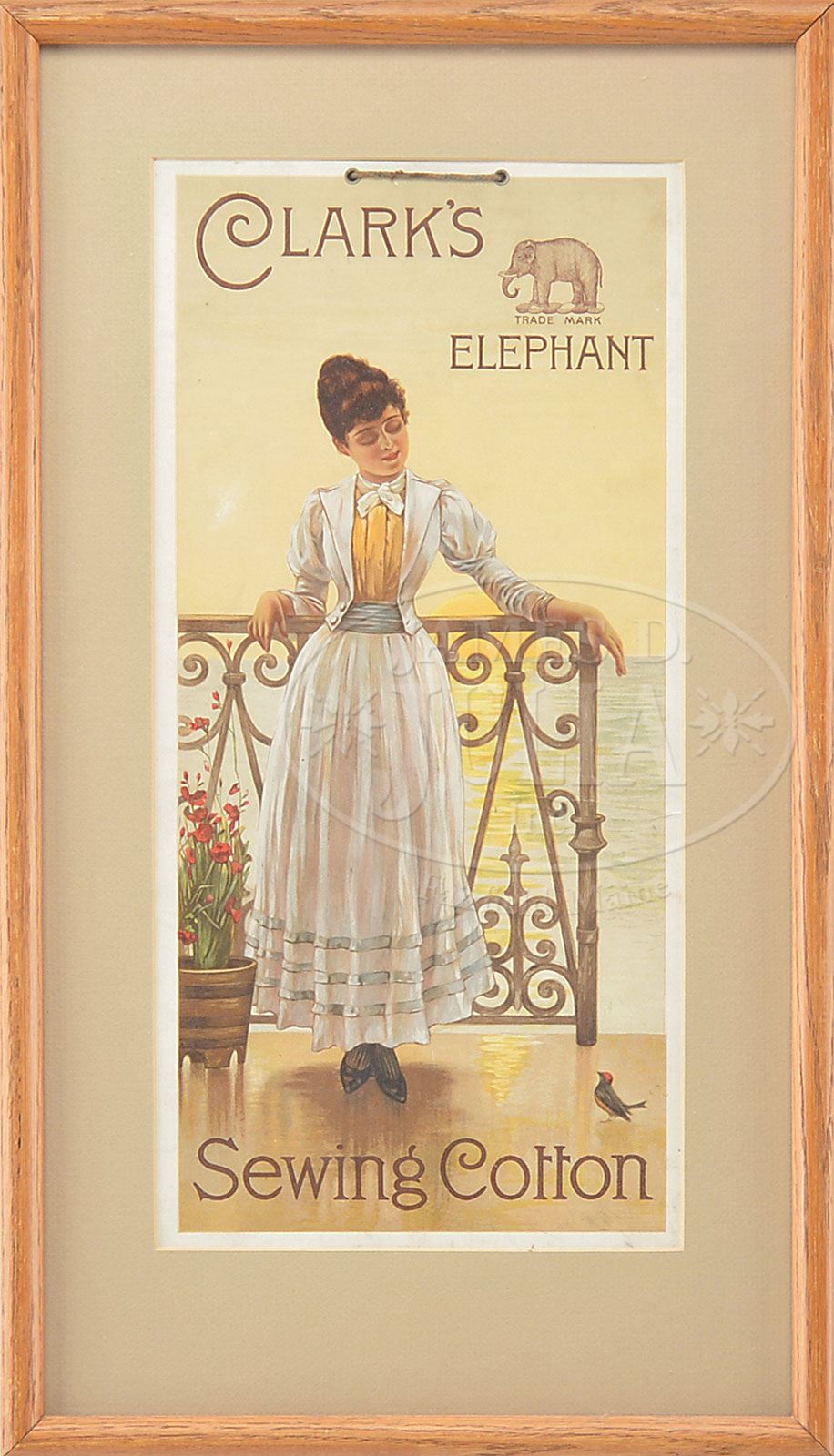 CLARK’S ELEPHANT BRAND SEWING COTTON SIGN. Attractive cardboard sign with an illustration of young woman posing against a wrought iron rail, as the sun sets over the ocean in the background. SIZE: 8″ w x 16-3/4″ t. CONDITION: Very good to excellent; soft horizontal crease; some light soiling/scuffs to bottom portion. 1-13067 (300-500) Auction: Advertising, Toy & Doll - June 2013 Please Note: All prices include the hammer price plus the buyer’s premium, which is paid by the buyer as part of the purchase price. The prices noted here after the auction are considered unofficial and do not become official until after the 46th day. |