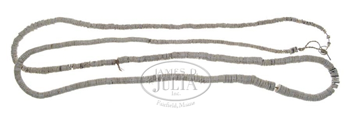 NECKLACE/BANDOLIER. Disc shaped beads of graduated sizes likely of ostrich shell strung on vegetable fiber. Owner says that this is “used in many of Moon’s photos and according to Moon and his family is of Apache origin”. Driebe 1997, pg 320. Size: 38-1/2”. CONDITION: No apparent damage, mild soiling. 4-55233 (400-700)