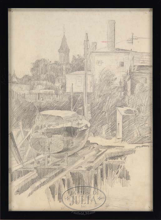 UNSIGNED (American, First half of the 20th Century) FIVE SKETCHES OF MARBLEHEAD, MASS. Pencil on paper sketches show different views of houses and boatyard, one titled “Marblehead 1923″. All housed in black modern frames. SIZE: Sight: Four are 11-3/4″ x 9-1/4″; one is 13-3/4″ x 9-3/4”. CONDITION: Very good. 9-94307 (1,200-1,600)