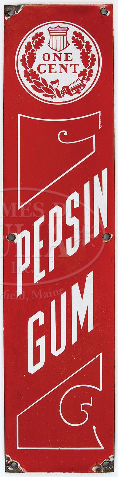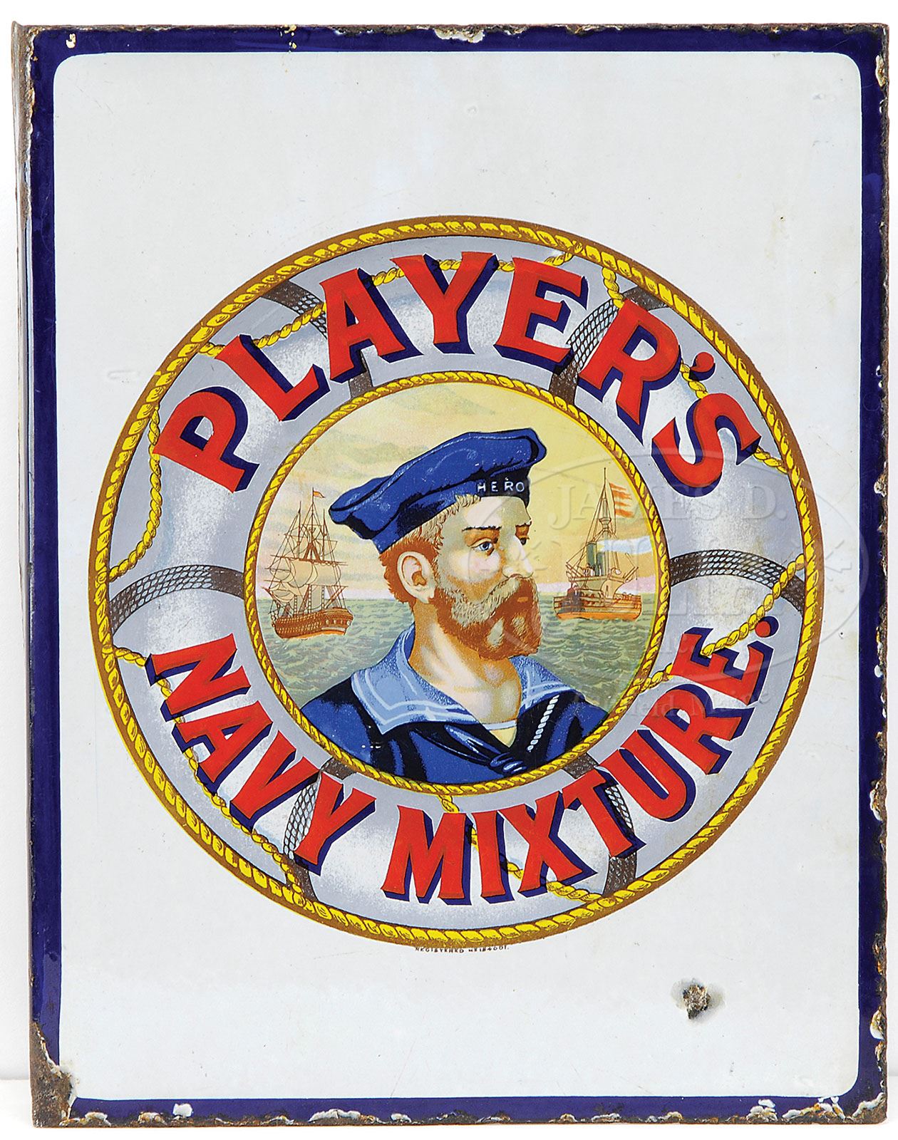LOT OF 7 PRODUCT PORCELAIN SIGNS. Lot of 7 signs includes: 1) Hallmark Umbrellas; 2) Alta Crest Farms; 3) Coles Penetrating Linament; 4) Coles Peruvian Bark & Wild Cherry Bitters; 5) IGA Store; 6) Pulver Pepsin Gum Machine side panel; 7) Player’s Navy Cut Tobacco Flange. SIZE: Largest is 14″ w x 18″ t. CONDITION: 1) Near excellent; 2) Very good; 3) Fair to good; 4) Very good w/ a few chips; 5) Very good; 6) Very good w/ chips at corners; 7) Very good. 1-12637-1 (600-900) Auction: Advertising, Toy & Doll - June 2013 Please Note: All prices include the hammer price plus the buyer’s premium, which is paid by the buyer as part of the purchase price. The prices noted here after the auction are considered unofficial and do not become official until after the 46th day. |