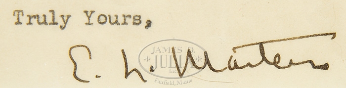 FRAMED AUTOGRAPH: EDGAR LEE MASTERS; POET (American, 1869-1950). This collage includes a typed letter dated December 17, 1929 on Masters stationary and signed in pen “E L Masters”. The letter is in regards to a purchaser of several of his books. Also included in a First Day Cover honoring Edgar Lee Masters, dated 1970 with stamp, two photographs and a program cover from a play “Spoon River Anthology” directed by Elwyn Dearborn. Housed in a gilt wood frame with white matte having five cutouts. SIZE: Total: 20″ x 20″. PROVENANCE: Collection of Elwyn Dearborn, Medford, NJ & Portland, ME. CONDITION: Very good, signature is bold, letter has folds. 9-96143 (150-250)