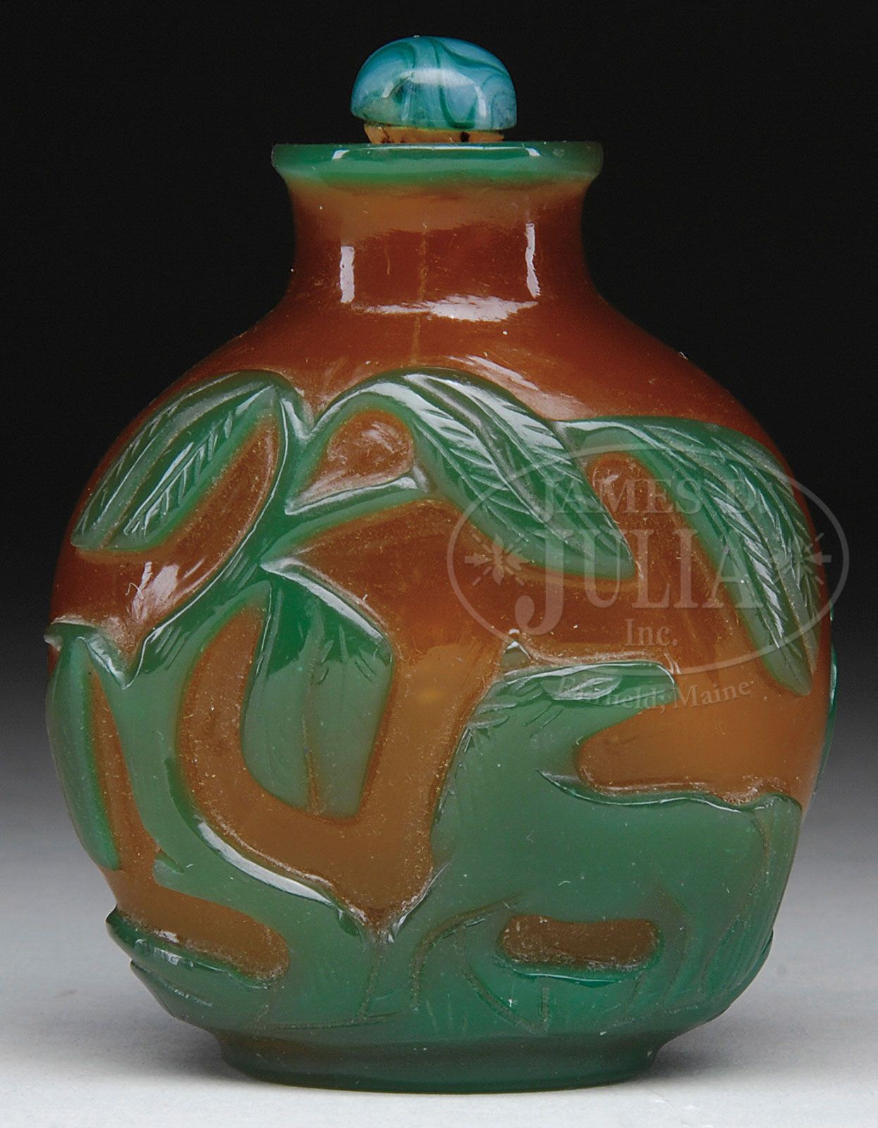 CAMEO GLASS SNUFF BOTTLE. China. Green cut to amber. Decorated with horse beneath a tree. Fitted with marbleized green stone stopper. SIZE: 3″ h. CONDITION: Very good. 7-72595 (100-200)