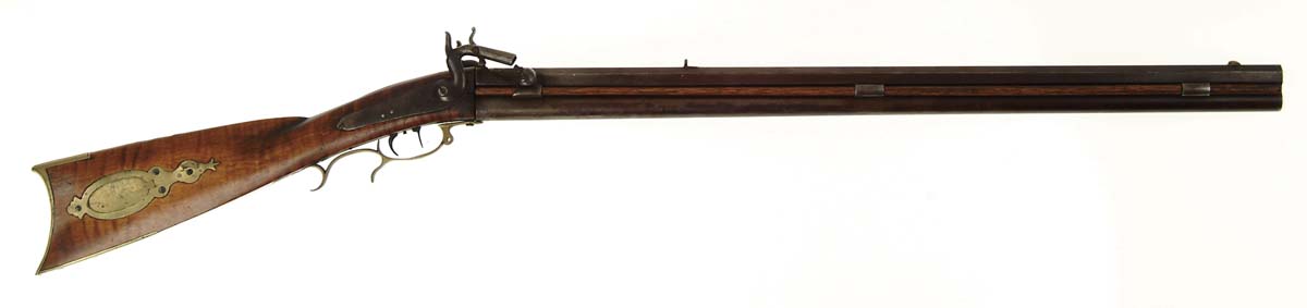 RARE SUPERPOSED LOAD OVER/UNDER RIFLE. NSN. Cal. .44/20 gauge, 29-1/4” oct & rnd bbl. Marked “LEWIS . MERZ . / LOCKHAVEN. PA. 1859” on top of the bbl. The right hammer has an extended nose to fire the front load in the top bbl. A swivel nose at the rear can be pivoted to fire the rear load. The date on this combination gun is 20 years earlier than he was known to have worked in Lockhaven. CONDITION: Gray/brown patina overall with moderate pitting at the rear of the rifle bbl. Cracks and repairs around the lock area with refinishing. Left rear side of the stock has light incised carving. Cheek piece has a man in the moon inlay. Mechanically fine. 4-54282 FS18 (1,500-3,000)