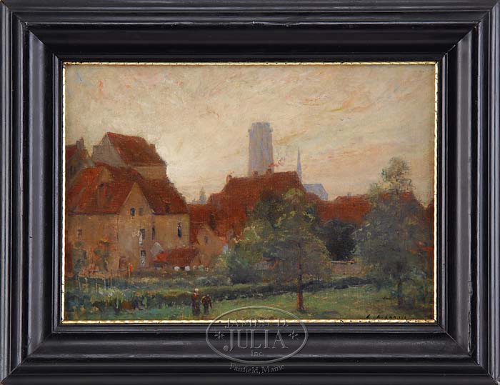 SIGNED (European, 19th Century) A EUROPEAN VILLAGE. Oil on canvas mounted on panel summer scene shows two figures in grass and tree area outside a town with cathedral and other buildings. Signed indistinctly lower right. Housed in a black painted molded wood frame. SIZE: 14″ X 19-1/4″. CONDITION: Very good with minor inpainting. 9-95397 (600-800)