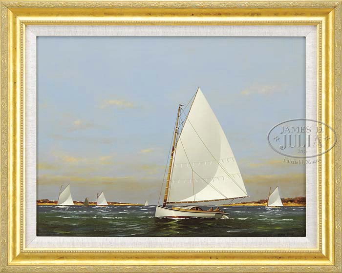 VERN BROE (American, 1930-) CATBOAT. Oil on board summer sailing scene shows a small sailboat with two people aboard traveling right to left with five other similar boats in a large inlet area. All under light blue & cloud sky. Signed lower right. Housed in a gilt frame with linen liner. SIZE: 18″ x 24″. CONDITION: Very good to excellent. 9-23182 (800-1,200)