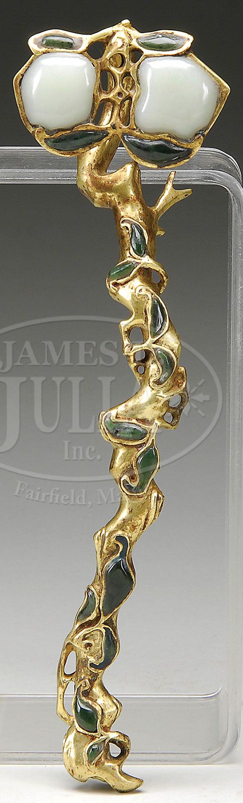 RUYI SCEPTER. 20th century, China. Gilt bronze cast in the form of a branch of peaches. Inlay of peaches and foliage in green and white jade. SIZE: 11-1/2″ l. CONDITION: Very good. 9-27968 (700-900)