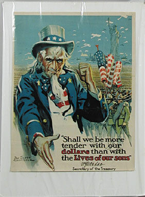WAR BOND POSTER. Colorful Uncle Sam pictured. “Shall we be more tender with our dollars than with the lives of our sons? Buy a United States Government Bond of the 2nd Liberty Loan of 1917.” Artist: Dan Sayre Groesbeck. SIZE: 20″ x 30″. CONDITION: Very good with one fold crease in the extreme upper 3″ running horizontally. 1 1/2″ tear in the extreme upper margin. 1-27268 (250-350) Auction: Advertising, Toy & Doll - Fall 2001 Please Note: All prices include the hammer price plus the buyer’s premium, which is paid by the buyer as part of the purchase price. The prices noted here after the auction are considered unofficial and do not become official until after the 46th day. |