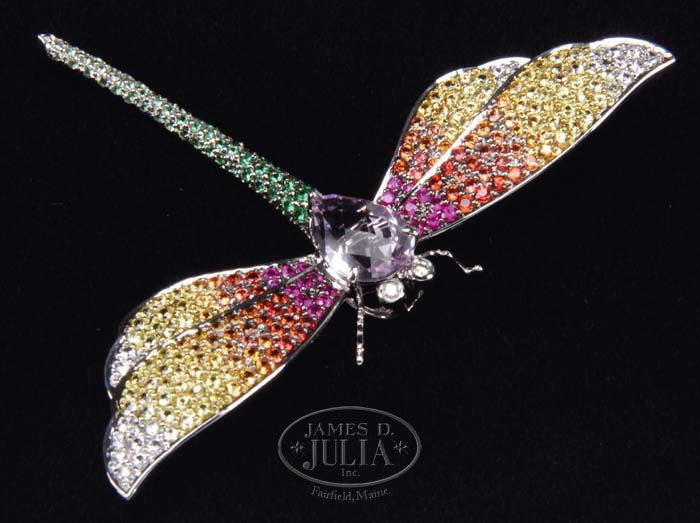 18KT WHITE GOLD & GEMSTONE DRAGONFLY BROOCH Wonderful stamped “18K” white gold dragonfly brooch has a center pear shaped 4.13ct light amethyst for the body. The wings are pave set with pink, orange and yellow sapphires and diamonds. The tail of the dragonfly is pave set with green garnets. The dragonfly is finished with diamond eyes. SIZE: 2″ l x 3″ w. CONDITION: Very good to excellent. 5-65596 (1,600-1,800)