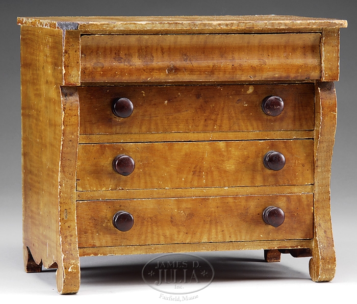 AMERICAN EMPIRE DOLL’S CHEST OF DRAWERS. First half 19th century. The rectangular pine case, with grained finish fitted with four drawers on turned frontal legs. SIZE: Ht 9 3/4″ W 10 3/4″ D 7″ CONDITION: Retains all original surfaces. The proper right front of top cut, right rear corner of top with missing strip of wood. Finish somewhat dry. 9-97688 (300-500)