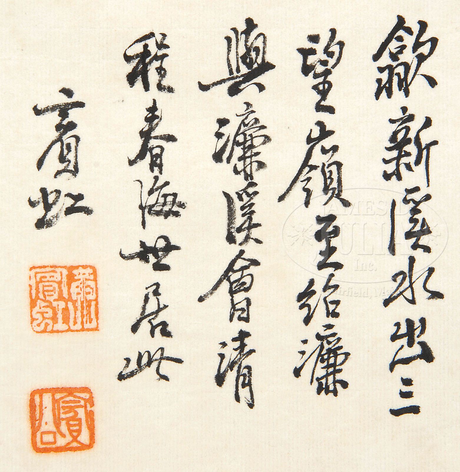 HANGING SCROLL, CHINA. Ink and light color on paper, depicting a landscape with a pavilion, river and dense trees. Signed “Binhong,” with three seals. SIZE: 53-1/2″ x 13-1/2″. PROVENANCE: From a Midwest Private Collector. CONDITION: Good. 7-72994 (800-1,200)