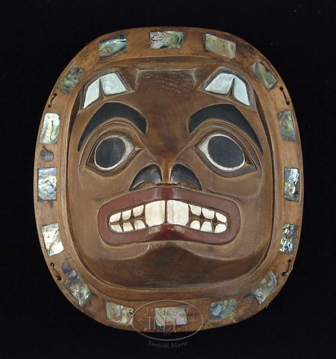 NORTHWEST COAST FRONTLET, LATE 19TH CENTURY. Beaver face, carved of one piece of wood, highlights painted, border inset with rectangles of abalone. Size: 7” x 6”. CONDITION: Overall light patination, no apparent damage. 4-55161 BL75 (2,000-4,000)