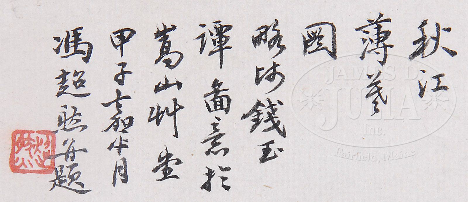 LEAF PAINTING, CHINA. Ink and color on paper, finely depicting an autumn mountainous landscape. Inscribe, signed “Feng Chaoran,” dated jiazi year, with three seals. SIZE: 7-3/4″ x 10-3/4″. CONDITION: Good. 9-26403 (300-500)