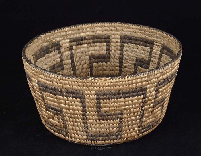 TOHONO-OODAM (PAPAGO), BASKET, EARLY 20TH CENTURY. Willow and devil’s claw over grass foundation, fret pattern. Size: 12” diameter x 6” high. CONDITION: Few missing stitches, bottom wear negligible, overall surface soiling. 4-55155 BL76 (300-400)